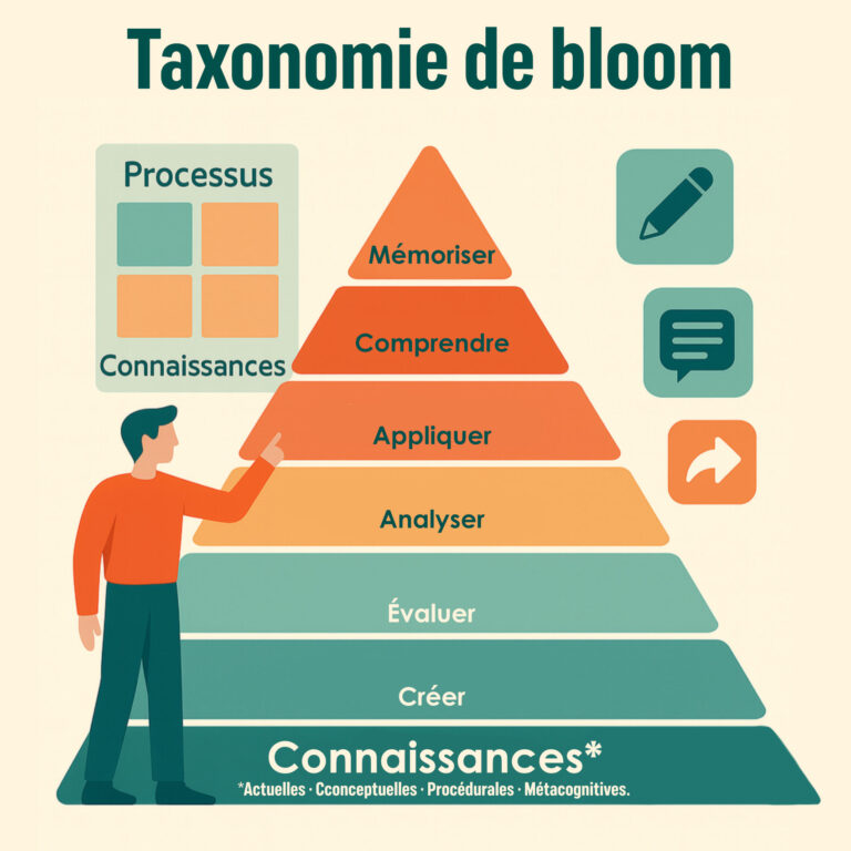 La taxonomie de Bloom est l’un des repères pédagogiques les plus utilisés pour structurer les objectifs d’apprentissage, aligner les activités et construire des évaluations cohérentes. Popularisée dans les années 1950 puis révisée en 2001, elle aide à passer d’un simple « se souvenir » à « créer » en balisant la progression cognitive. Cet article propose une lecture claire et opérationnelle de la taxonomie (originale et révisée), des modèles d’objectifs « verbe + objet », des exemples applicables en formation numérique (WordPress, IA générative, bureautique), et une ouverture vers la « Bloom’s Digital Taxonomy » pour actualiser vos cours et vos évaluations.