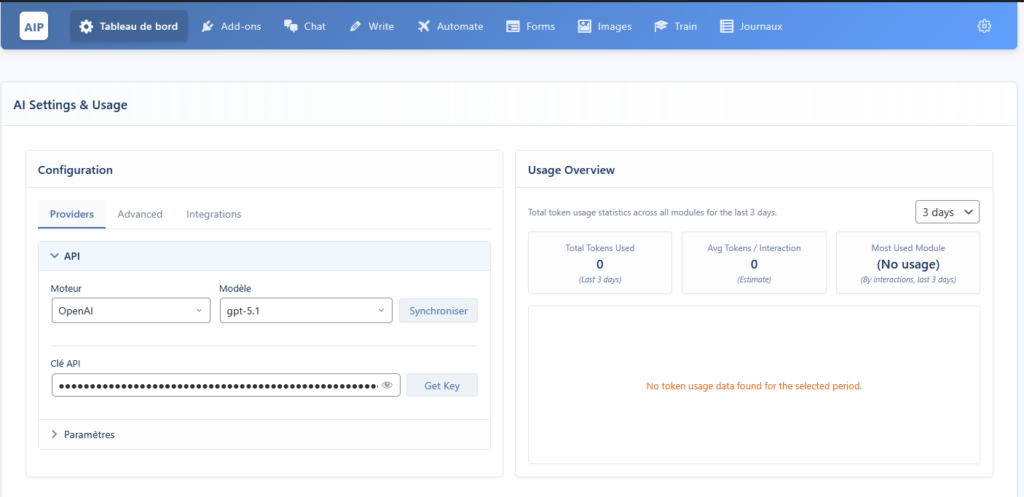 Créer un compte OpenAI, https://openai.com/ Après connexion ou création de compte rendez-vous sur https://platform.openai.com/ Ensuite dans Paramètres > Billings > Add to crédit balance. Retour sur votre site, allez dans AI Power > settings, puis cliquez sur « Get Your Api Key« .