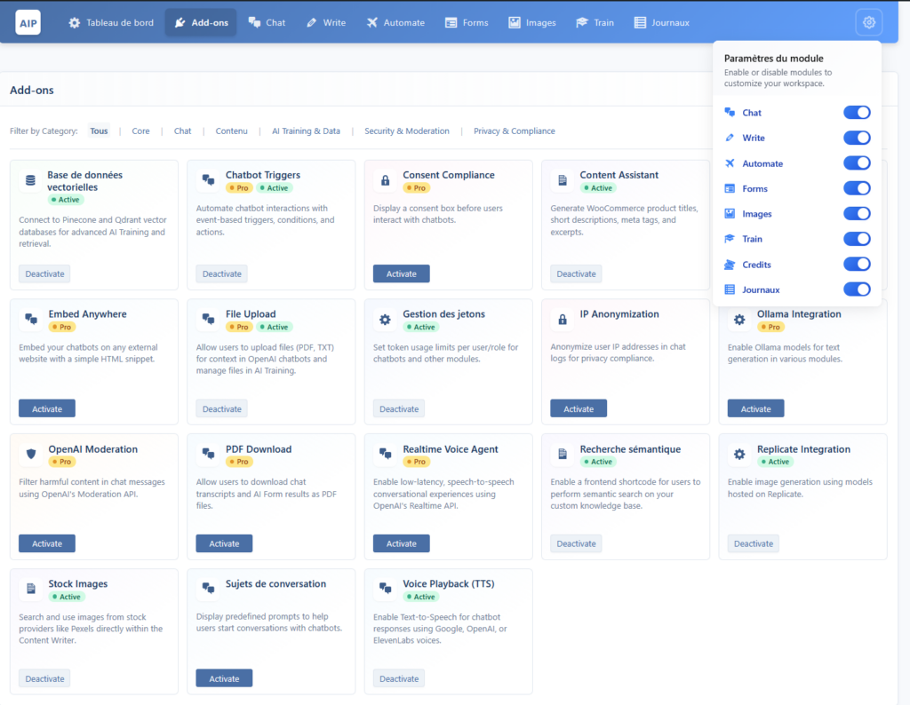 Chatbot AI : AI Power inclut la possibilité d’ajouter un chatbot alimenté par l’intelligence artificielle à votre site web. Cela peut aider à fournir un service client automatisé, répondre aux questions des utilisateurs, ou même guider les visiteurs sur le site.