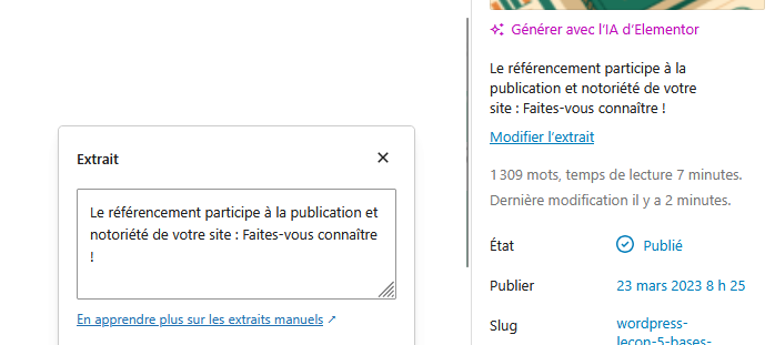 Le slug correspond au « permalien » rempli dans la colonne de droite (même fonction, mais affichée dans le moteur de recherche).